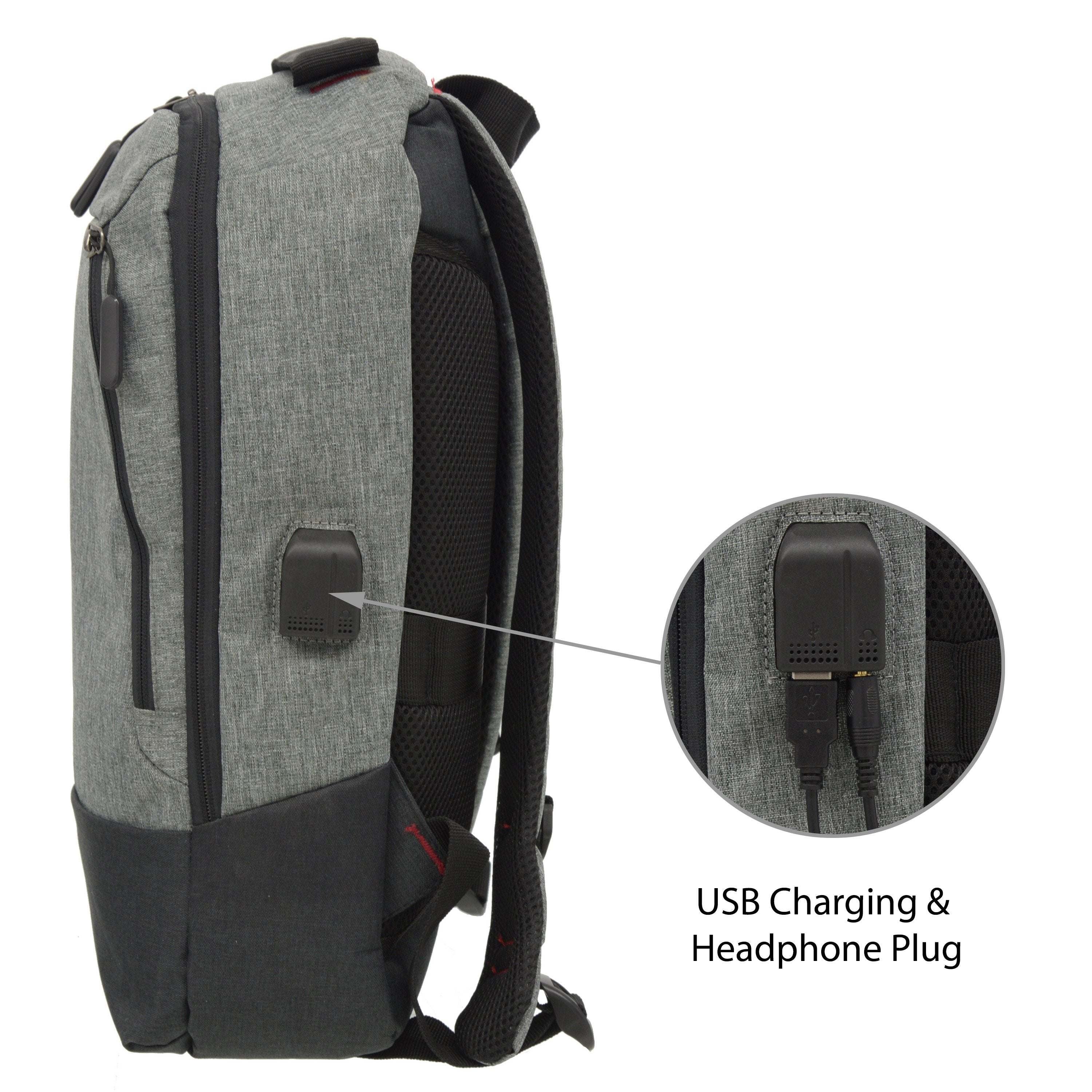 2 interior mesh organizer pockets and zipper pocket for phones and electronic accessories, Front slant zipper pocket, Padded nylon webbing top Handle, Stylish and durable material, External USB charging port with Charging cable, Padded back panels, Suitcase trolley retention strap, Comfortable padded backpack straps.
